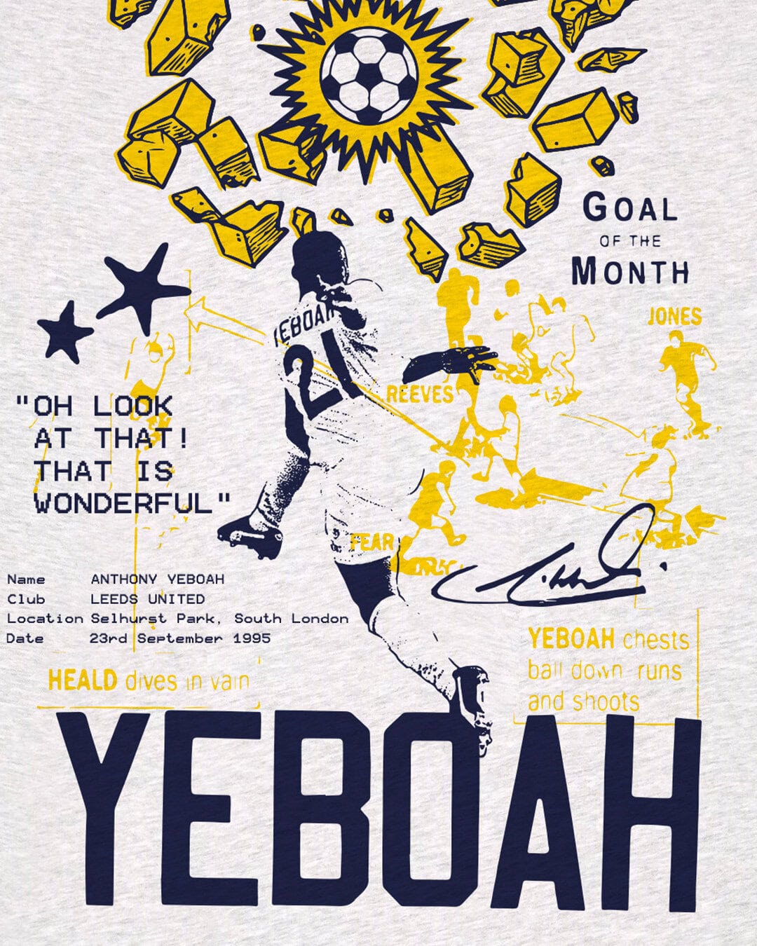 Thirty years ago Tony Yeboah scored a goal at Selhurst Park so fearsome that crossbars around the country are still trembling, so we had to celebrate the anniversary with a new t-shirt featuring a backprint and front pocket print designed by Limited Output.